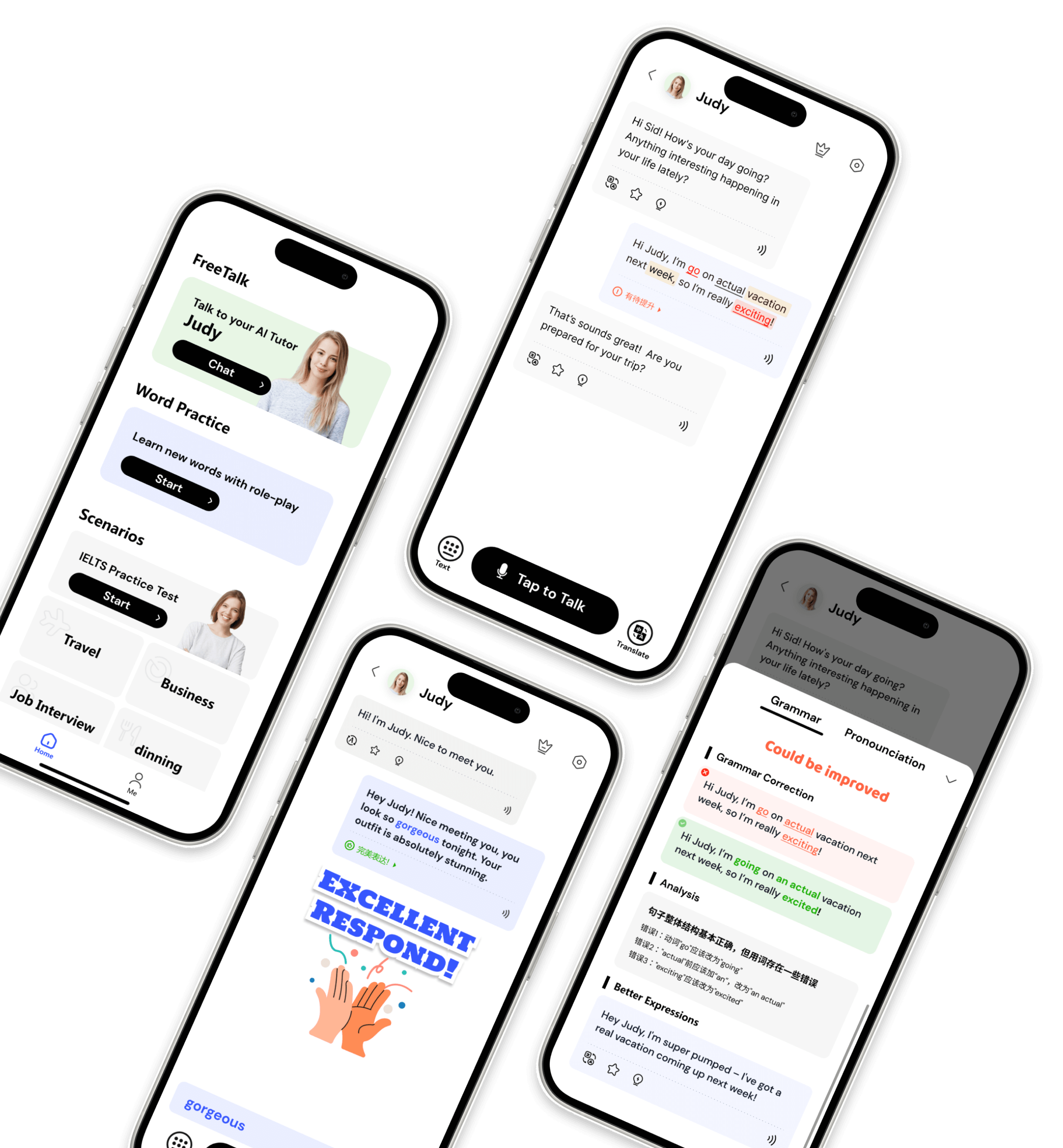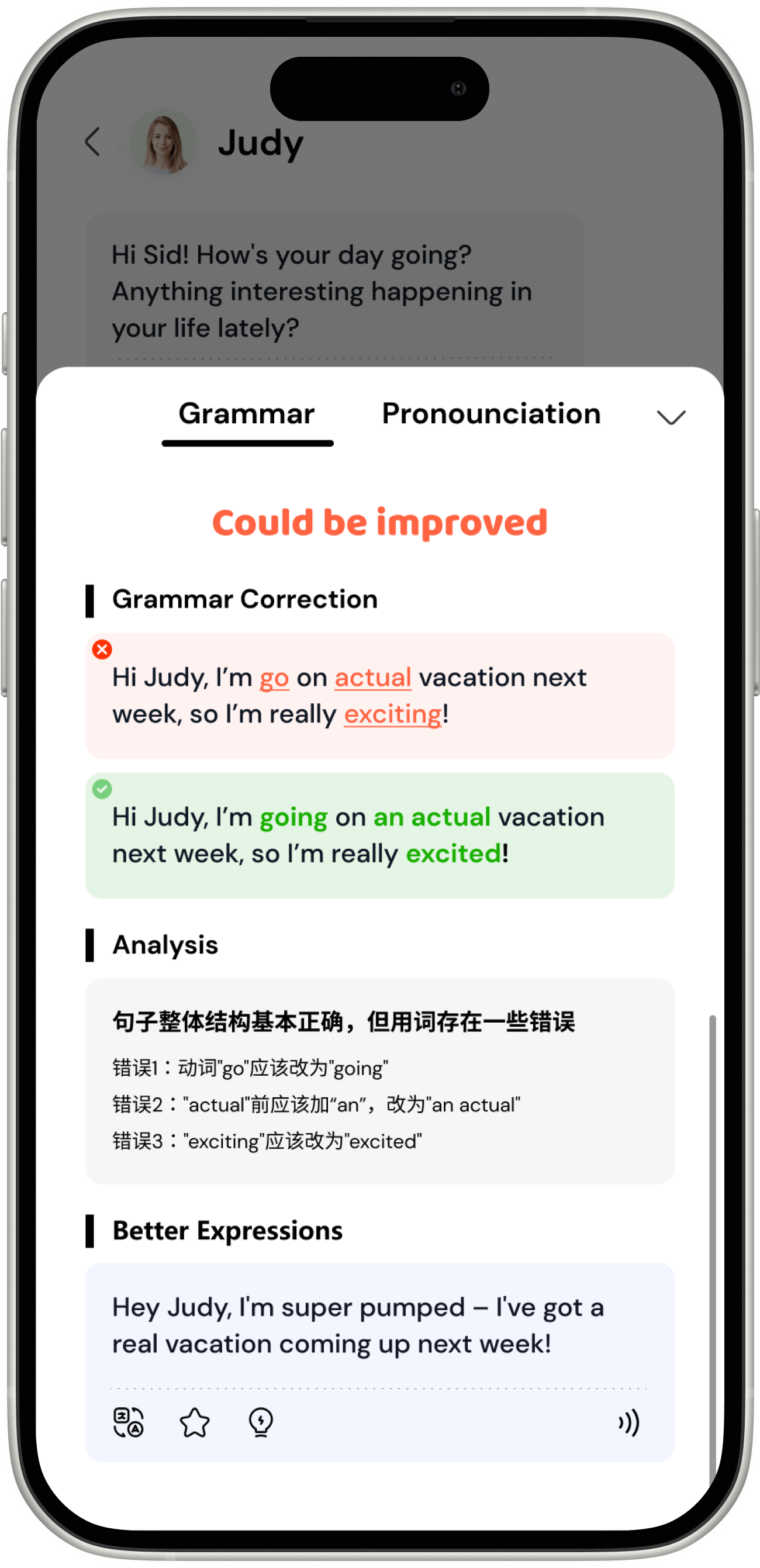 Polish your pronunciation, correct your grammar, and refine your phrasing