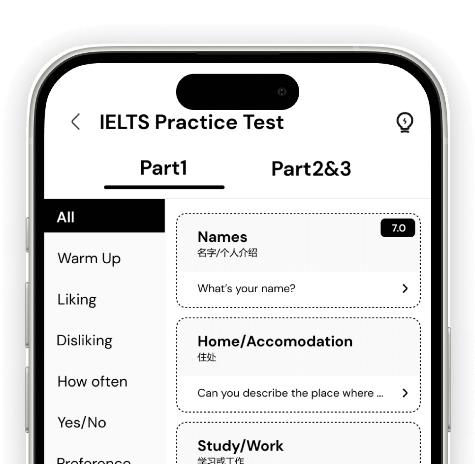 Full IELTS Speaking questions, instant corrections, answer hints, and complete mock tests.